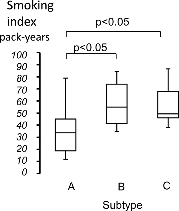 Smoking index was compared among three subtype groups and there were significant differences among them (Table 1). Smoking index of both Subtype B and Subtype C were significantly higher than that of Subtype A groups (Fig. 2). In addition, there was no significant difference between Subtype B and Subtype C groups.