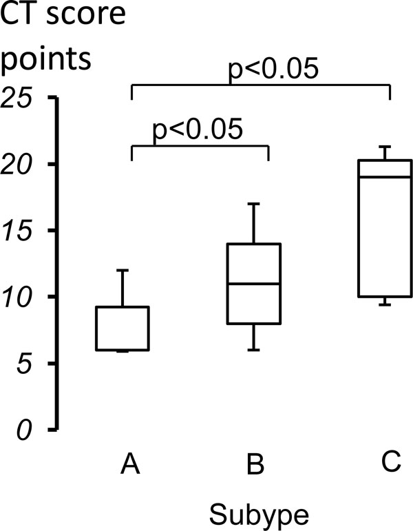 CT scores were compared among three subtype groups and there were significant differences among them (Table 1). CT scores of both Subtype B and Subtype C were significantly higher than that of Subtype A groups (Fig. 3). In addition, there was no significant difference between Subtype B and Subtype C groups.