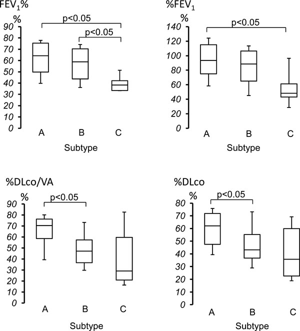 FEV1% was significantly lower in Subtype C as compared to both Subtype A and Subtype B groups. There was no significant difference between Subtype A and Subtype B groups. %FEV1 was significantly lower in Subtype C as compared to Subtype A groups. There was no significant difference between Subtype A and Subtype B, and between Subtype B and Subtype C groups (Fig. 4). Both %DLco/VA and %DLco were significantly lower in Subtype B as compared to Subtype A groups. There was no significant difference between Subtype A and Subtype C, and between Subtype B and Subtype C groups (Fig. 4). In addition, there was no significant difference in %VC, FVC, RV/TLC%, , and MMF among three subtypes.